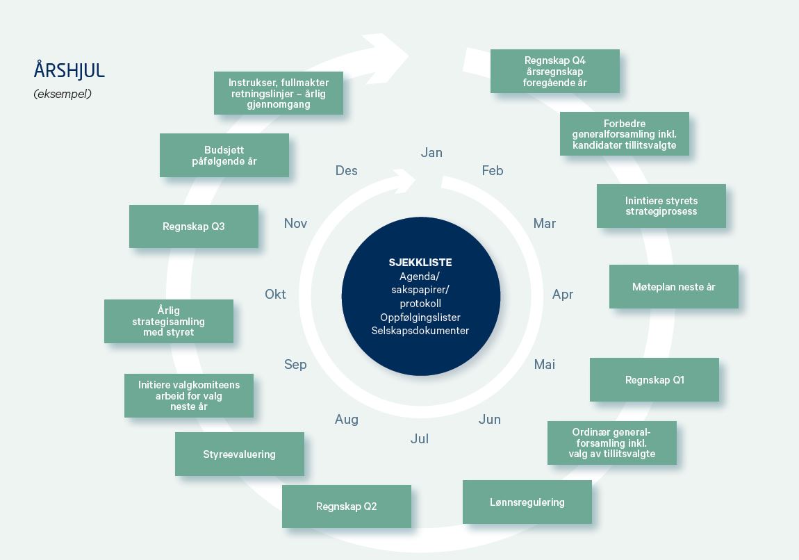 - Faste saker og oppgaver for alle styrets møter i løpet av et kalenderår, som budsjett og delårsrapporter