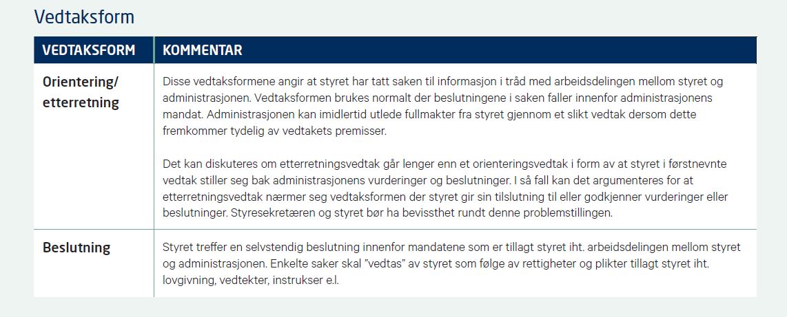 Styresekretæren må videre være oppmerksom på ulike vedtaksformer, som bør anvendes konsekvent.